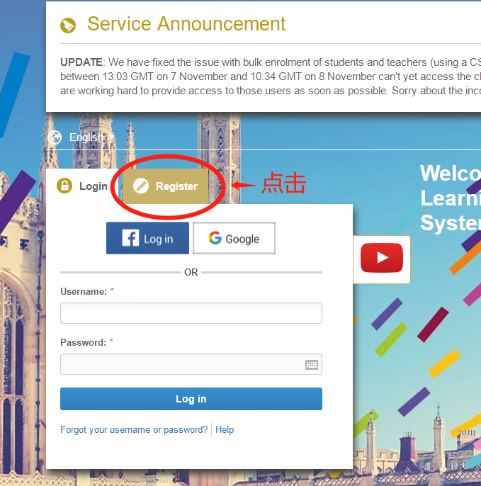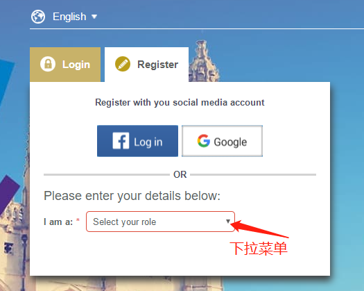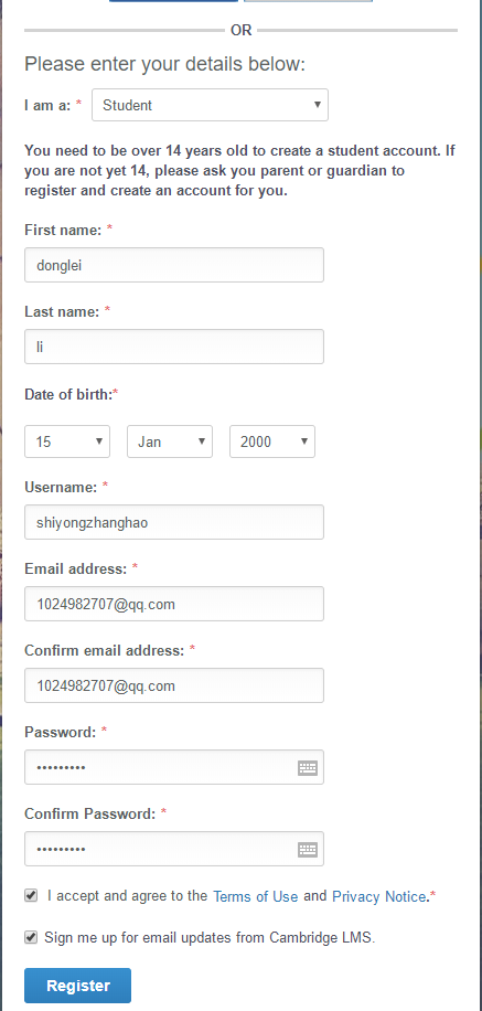 第三步:点击下拉菜单,选择学生,填写详细信息之后,点击 蓝色的Register注册